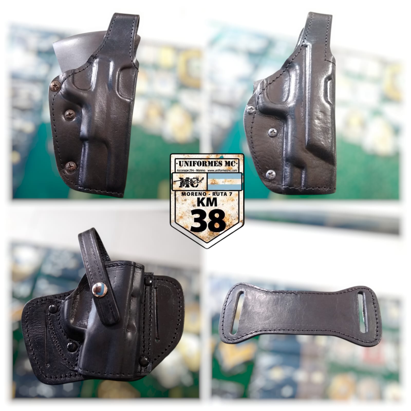 PISTOLERA DE CUERO DESPLAZADA NEGRA DE CUERO TERMO FORMADA, PEGADA Y COCIDA. FORRADO EN SU INTERIOR CON BROCHES, REMACHES Y TORNILLOS METALICOS. SAQUE RAPIDO. TIENE PASADOR INTERNO PARA SU AGARRE CON EL CINTO.