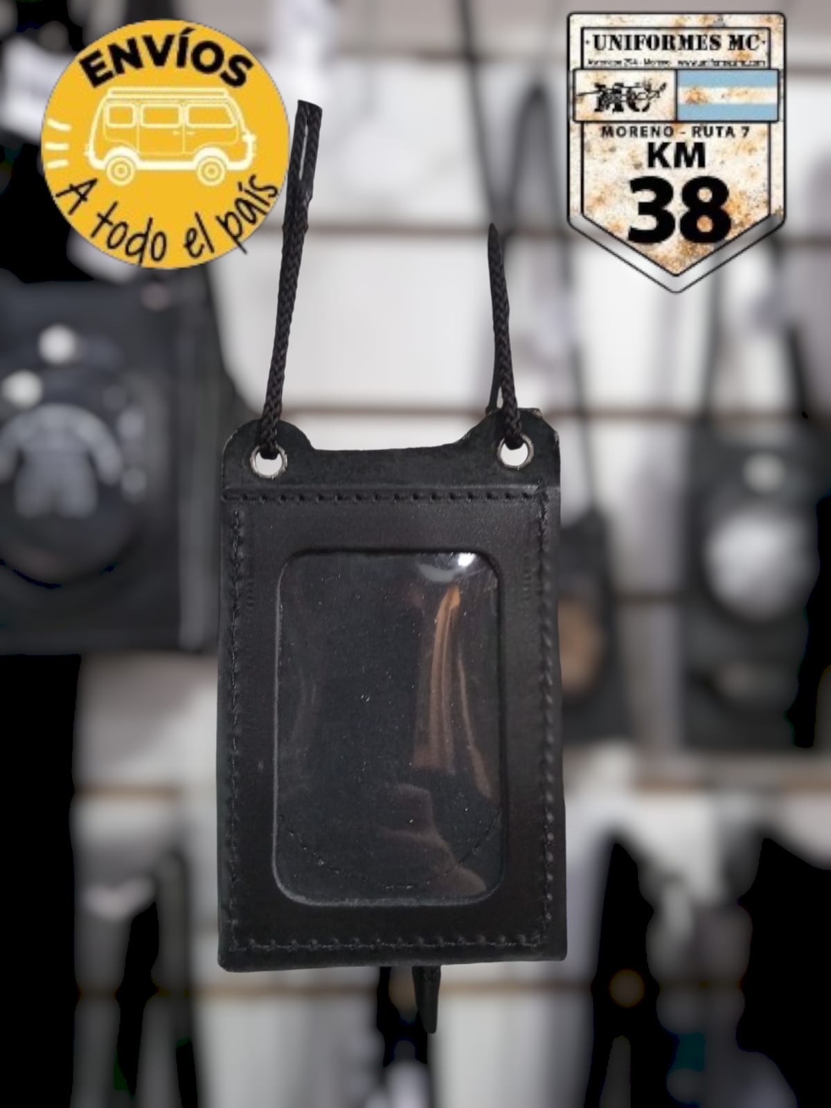 PORTA CREDENCIAL COLGANTE DE CUERO NEGRO COCIDO, FORRADO EN SU INTERIOR. CON ESPACIO PARA PONER CREDENCIAL-TARGETA, Y ESPACIO PARA PONER CREDENCIAL-CHAPA.